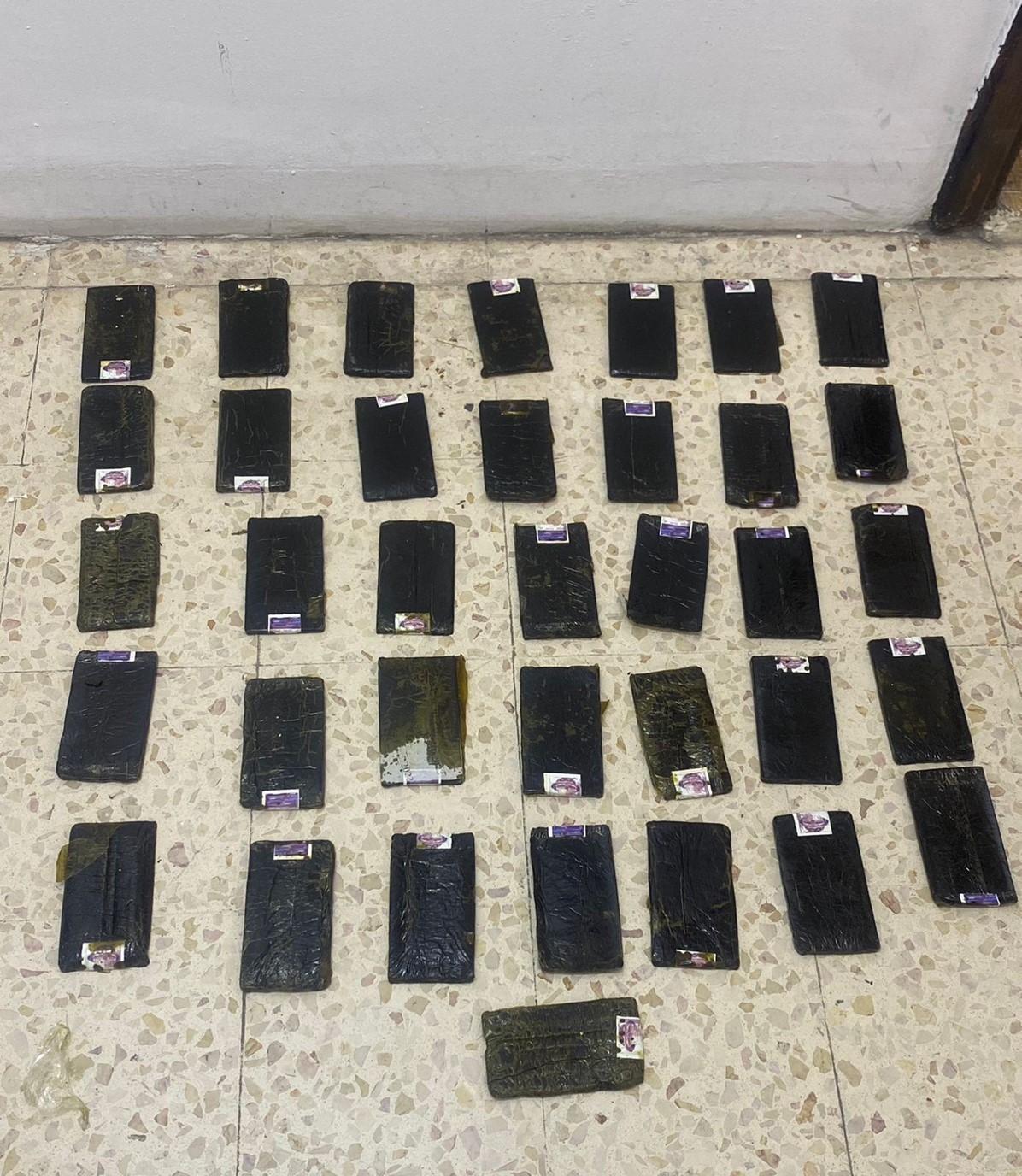 In Jerash Governorate, authorities, acting on verified information about a drug dealer transporting narcotics from Ramtha District toward Jerash with an accomplice, raided their location, arrested both suspects, and seized 40 slabs of hashish.