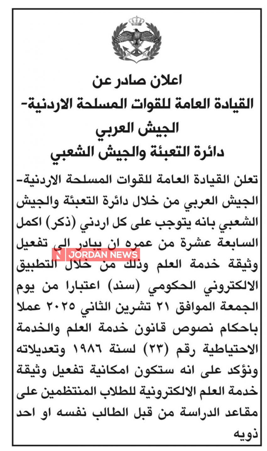 The General Command of the Jordanian Armed Forces – Arab Army announced on Thursday that every Jordanian male who has reached the age of 17 must activate the National Service document through the government digital application “Sanad.”