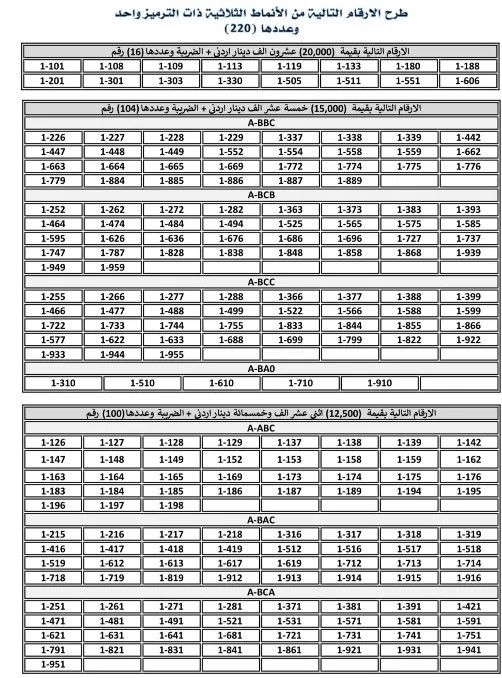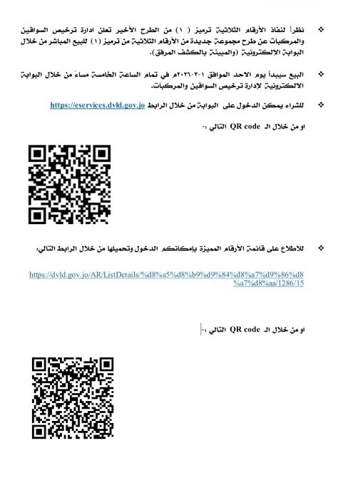 The Driver and Vehicle Licensing Department (DVLD) announced on Thursday the offering of distinguished three-digit license plates from the "Code 1" series for sale via its electronic portal. This follows the complete sell-out of the three-digit numbers previously offered.اضافة اعلان