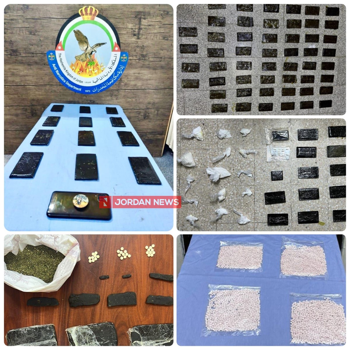 In Ruweished District, a high-risk individual was tracked, raided, and arrested, with 8,000 narcotic pills seized. In the central Badia, a drug dealer was arrested with 18,000 narcotic pills in his possession. In Ma’an Governorate, nine slabs of hashish were seized from a dealer.
