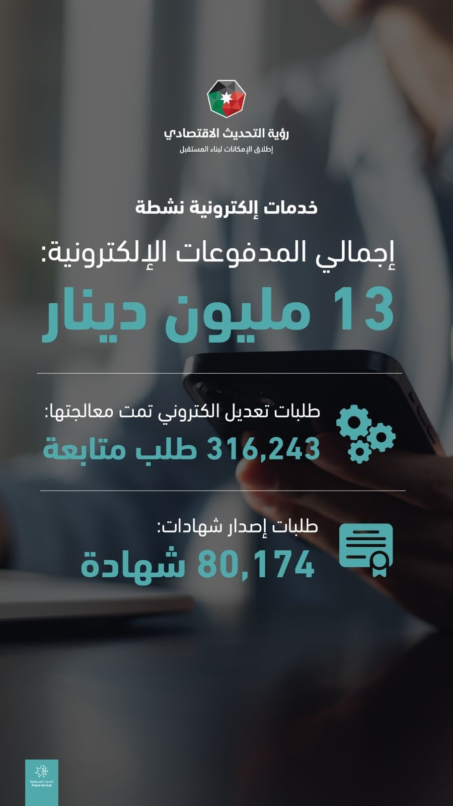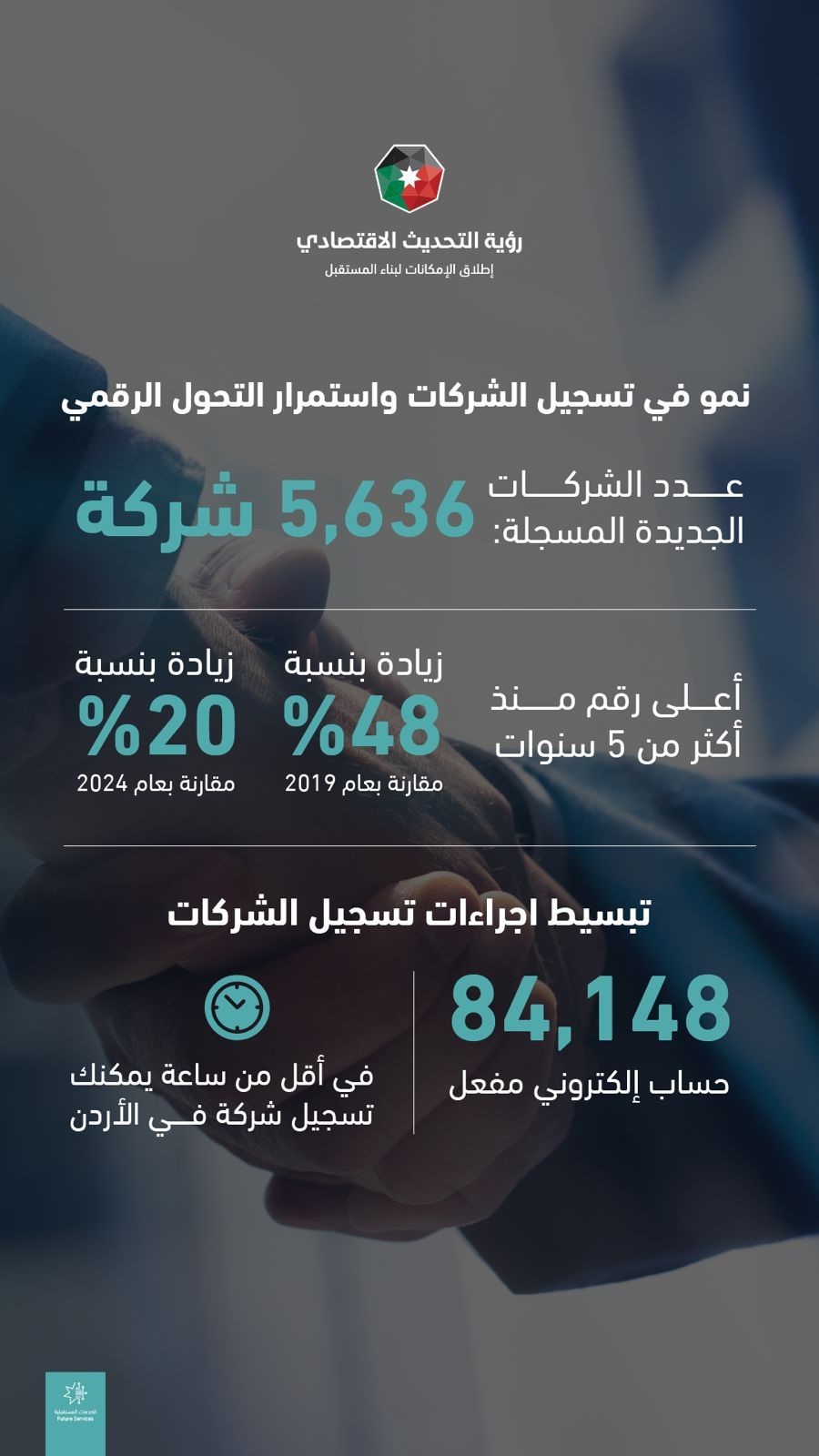 The total registered capital of companies during the same period reached JD 323 million. The most common type of registered companies was the “limited liability company,” with 4,078 registrations, accounting for 72.4 percent of the total registered capital, amounting to more than JD 104 million.