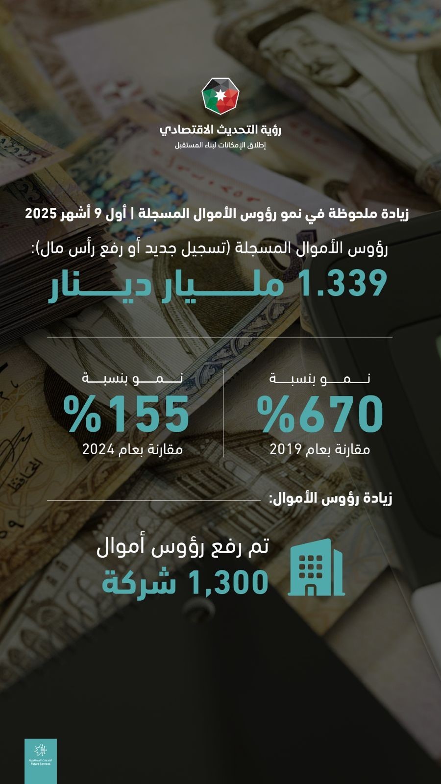 Additionally, the net increase in company capital rose by 148 percent compared to the same period in 2024. Some 1,300 companies raised their capital by about JD 1.16 billion, while 203 companies reduced their capital by approximately JD 194 million.