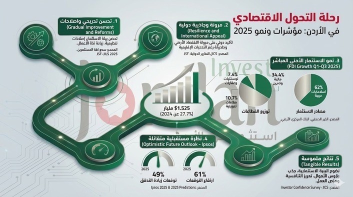 Economic data and indicators released for 2025 reveal a strategic transformation in Jordan’s investment climate. Legislative and procedural reform frameworks have succeeded in moving the investment environment from the structural planning phase to a stage of reaping tangible results and achieving record-breaking figures.