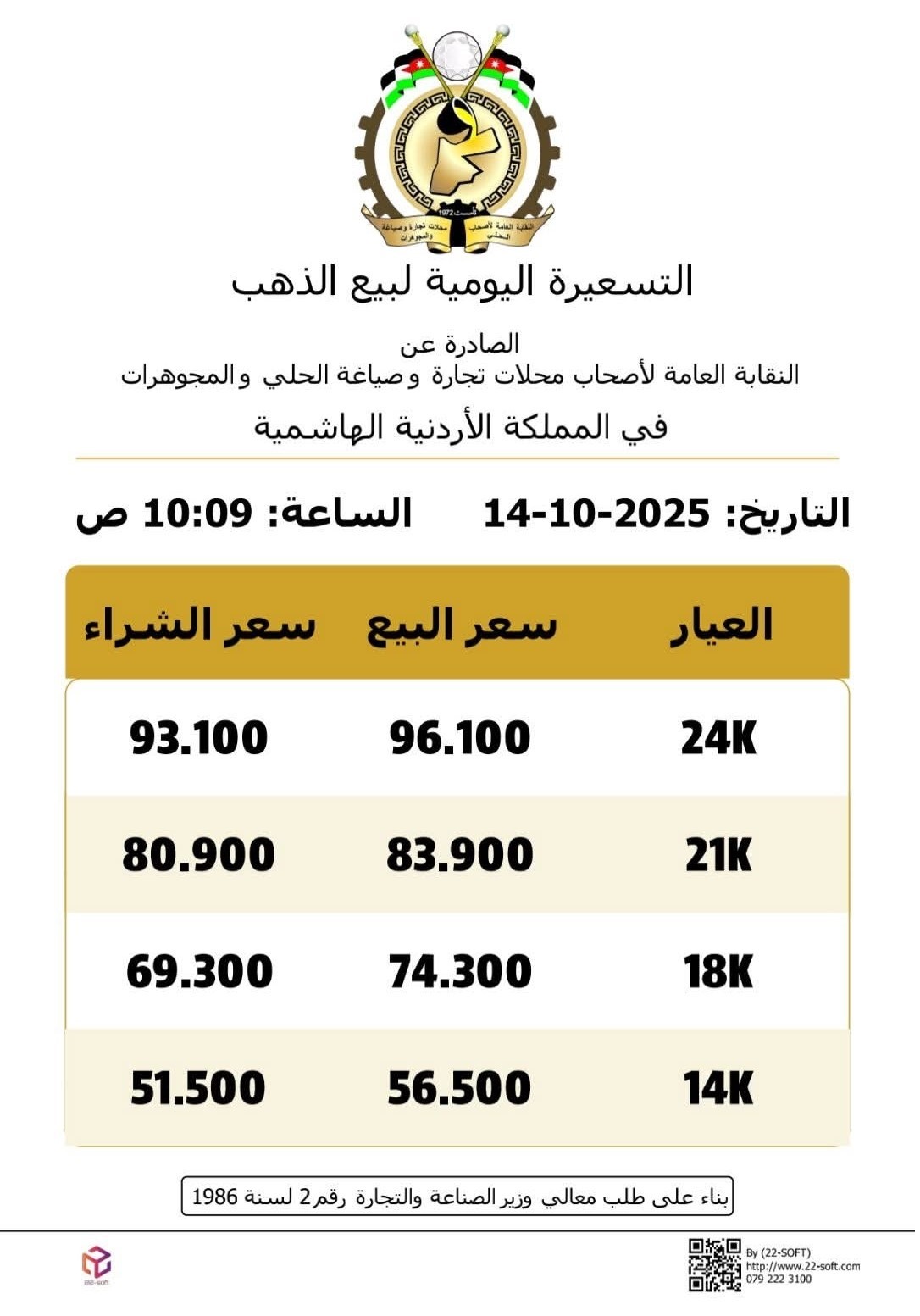 According to the daily bulletin issued by the General Syndicate of Owners of Trade and Jewelry Shops, the price per gram of 24-, 18-, and 14-carat gold rose to 96.1 dinars, 74.3 dinars, and 56.5 dinars, respectively, for selling purposes at jewelry stores.