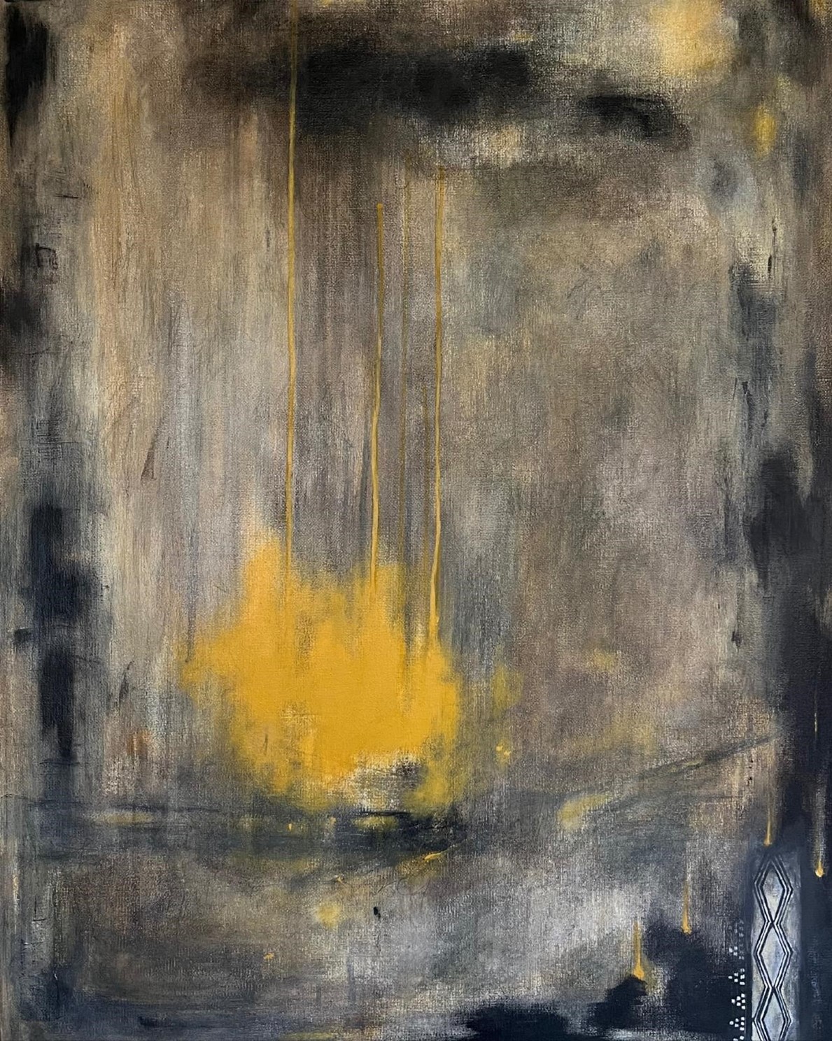 Each painting is a multi-layered story, watercolors drifting in quiet shadows, acrylic blazing like sunset fire, charcoal cascading like sudden rain, and Sadu threads woven by hands that carry memories from the dunes. Here, materials do not merely adorn the surface; they mimic the soul and commune with the innermost self.
