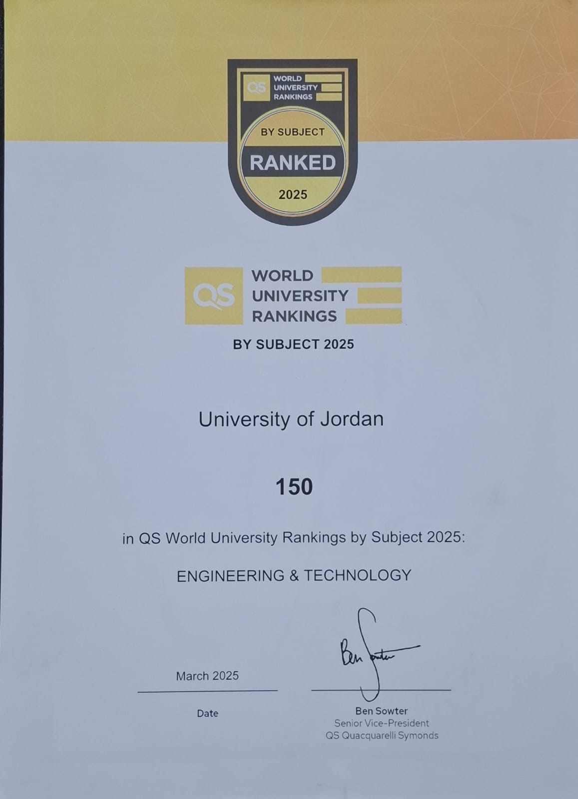 It is noteworthy that the Faculty of Engineering at the University of Jordan is one of the distinguished colleges globally, where it recently received a QS rating of 150 globally .